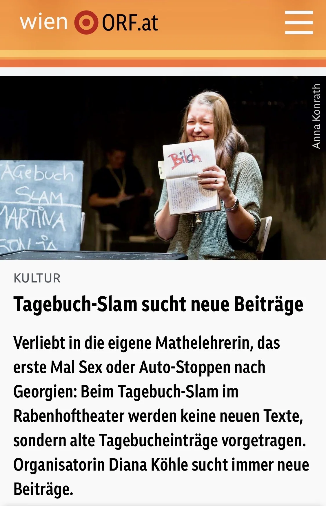 Aufruf für mutige Tagebuch-Slam-Teilnehmer:innen auf der orf.at Startseite, wirkt ;-)) - 23.11.2025