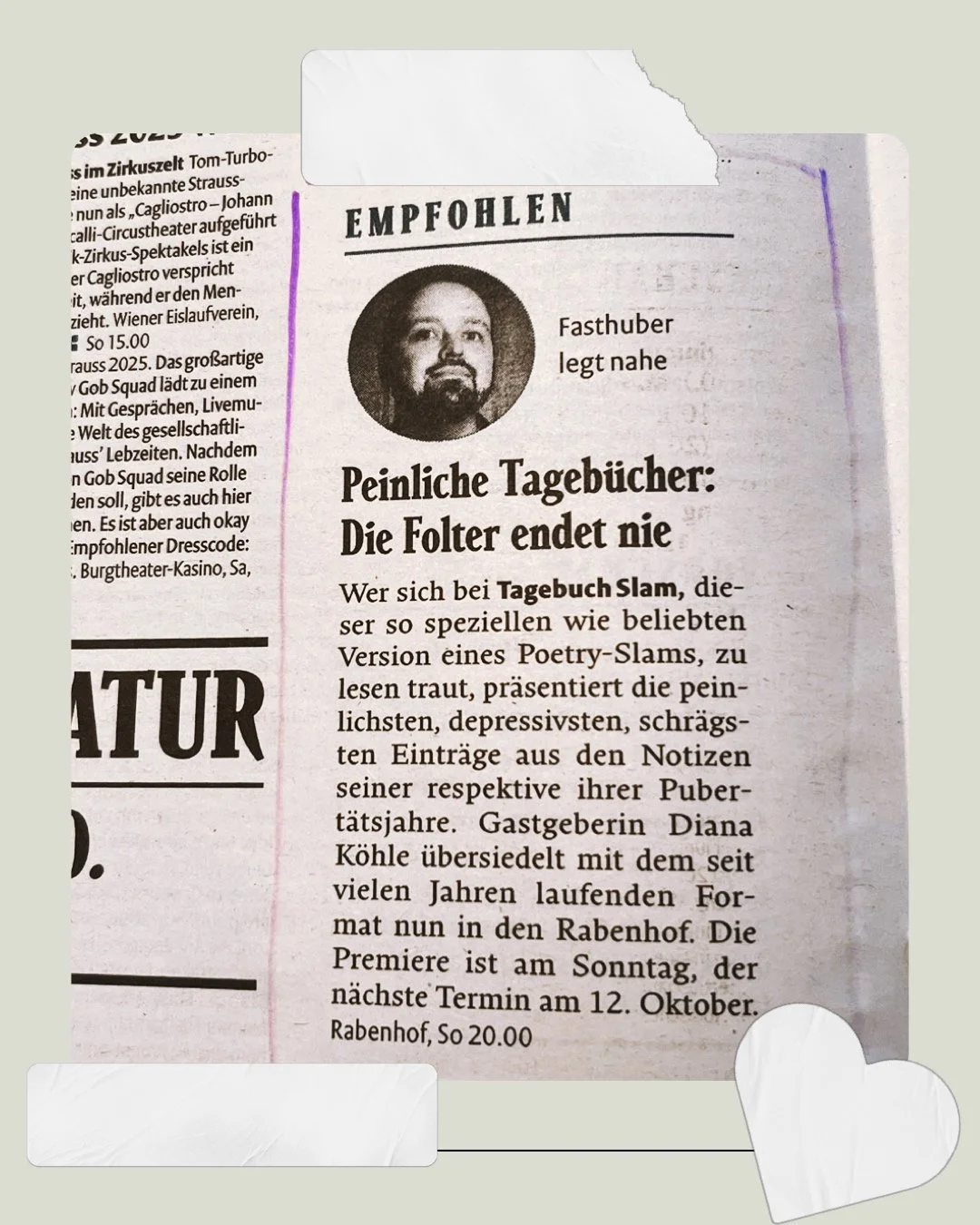 Wiener Zeitung über neue Lockdown Formate, da darf der Tagebuch Slam Podcast natürlich nicht fehlen - 17.05.21