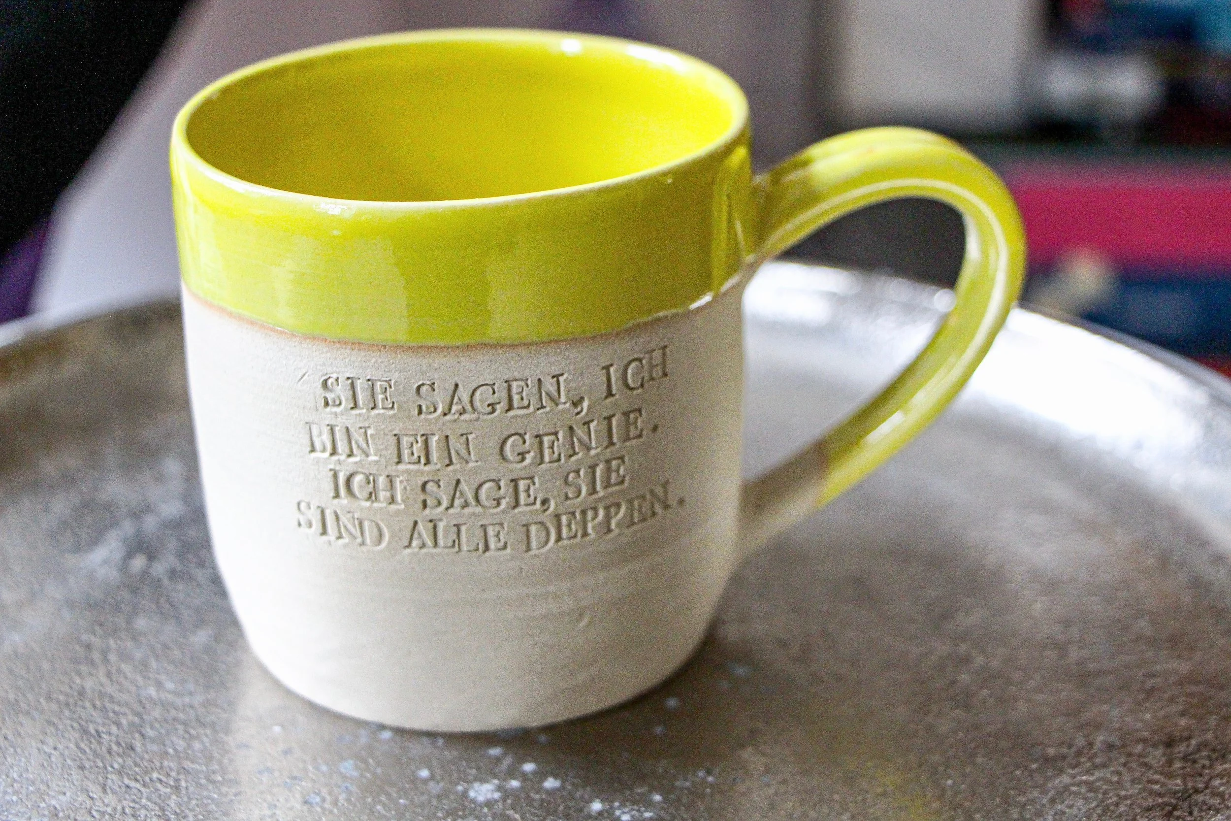 Neu: rote, grüne, blaue und gelbe Tassen mit Tagebuch Slam Zitaten von Scherbenreserl.